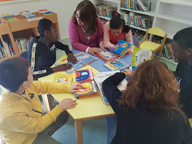 En aquesta ocasió han tingut temps de gaudir de la biblioteca: retornar els préstecs que tenien, mirar contes, escoltar el conte de “siempre sentado en mal sitio”... i parlar-ne una mica!!! Han esmorzar a fora i s’han endut material sobre ecologia en préstec per treballar a classe.